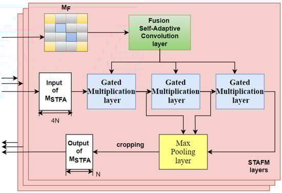 As illustrated in Figure 2, after the max pooling layer, is cut into the shape of , which can represent complicated anisotropy []. There are layers stacked in the STAFM. As a consequence, the cropped connection of the intermediate time step is organized into .