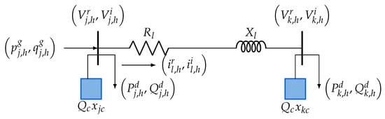 Note that the proposed MIQC formulation defined in Equations (1)–(5) has the following interpretation: Equation (1) defines the approximated annual grid operative costs of the network, which correspond to the sum of the expected costs concerning the energy losses and the installation of the fixed-step capacitor banks. Equation (2) defines the active power balance equilibrium at node j for each period of time h, which is linear when the voltages and are assumed to be known. Equation (3) defines the reactive power equilibrium at each node for each period of time. Inequality constraint (4) defines the possibility of installing as much as one fixed-step capacitor bank type at node j. Finally, inequality constraint (5) limits the maximum number of fixed-step capacitor banks that can be installed in the distribution grid.