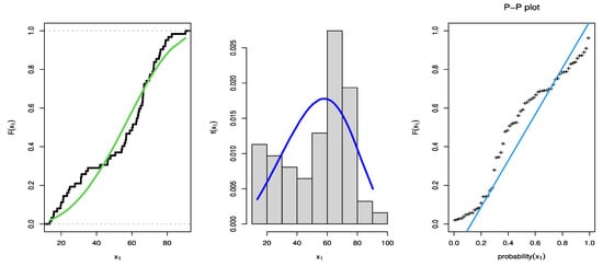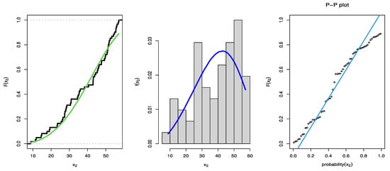 To see if the real data set follows the NH distribution, we utilized the Kolmogorov–Smirnov distance (KSD) test to obtain the p-value for making decisions. Table 7 contains the MLEs for the NH distribution with standard error (SE) and Akaike information criteria (AIC). Figure 1 and Figure 2 show the fitted CDF, estimated PDF, and P-P plots for each stress level of real data. These figures confirmed that the NH distribution is a fit for each stress level of this real data. According to the results of KSD and P-values for the NH distribution in Table 7 and Figure 1 and Figure 2, we conclude that the NH distribution is suitable for fitting each stress level of real data. If the P-value of the KS test is more than 0.05, then we may conclude that the distribution is a fit for this data. When the P-value of the KS test increases, the line of estimated cdf is near the empirical cdf, and the line of estimated pdf has drowned the histogram of data. Table 7 shows the KS test values and the P-value of the KS test < 0.5 as shown in Figure 1 and Figure 2. Table 8 shows the MLEs and Bayesian estimates for the parameters of the progressive-stress model and the MLEs and Kolmogorov–Smirnov test for each stress level of real data. Table 8 results were obtained after those of Table 7.