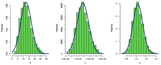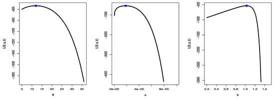Equating the first partial derivatives of (7) to zero and solving the resulting Equations (8)–(10) numerically, we could numerically obtain the MLEs , and for the three unknown parameters a, b, and θ. As a result, numerical solutions to the nonlinear system in (8)–(10) can be found using an iterative approach such as Newton–Raphson.