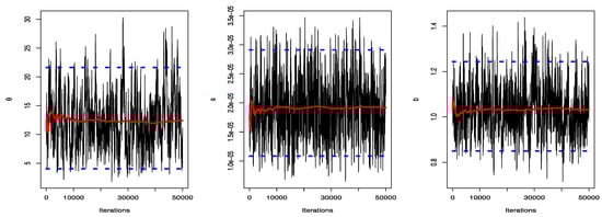 Because it is difficult to obtain the conditional posterior distributions of the parameters , and in the form of some well-known distributions, we employed the Metropolis–Hastings (MH) algorithm for generating posterior samples for the above conditional posterior distributions to obtain the appropriate Bayes estimates of the unknown parameters. However, drawing samples directly from the conditional posterior distributions of model parameters may be problematic. As a result, we need to choose appropriate known distributions to obtain these conditional distributions. More information about this topic can be found in [22,23,24,25,26,27]. In this study, we followed the steps of the MH algorithm to create a random sample from these conditional distributions:
