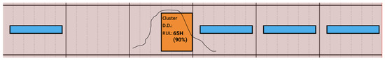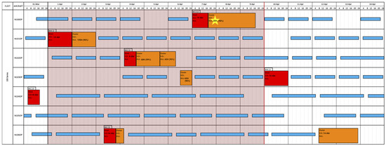 - Materials. The basic elements of a maintenance schedule (Figure 2):Flight: blue ribbons represent flights that some aircraft (row) can do at some time.Block: A predefined routine maintenance (A-checks).Cluster: A non-routine maintenance composed by other tasks not included in Blocks. This could have Due Date, RUL, both, or none.Canvas: The “background” of all artefacts, the scenario with information about the fleet, time representations and restrictions.