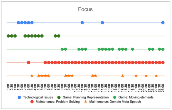 When we look at the focus of the conversation during stage 5 in Figure 3 we can see that at the beginning the participants talk about the representation of planning artefacts and deal with technical issues related with technology unfamiliar to participants before the workshop. Immediately after the problem has been placed, participants start talking about maintenance-related meta-speech (practices, procedures or regulations but not directly related to the resolution of the maintenance challenge). Only at 5:30, they change the focus to solve the problem, and only at 8 min, they start to manipulate the artefacts. From this moment onwards, the participants do not lose focus on solving the problem until the end of the exercise. This problem resolution is accompanied alternately by moments of artefact manipulation or maintenance-related meta-speech.