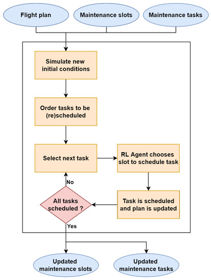 A scheduling priority is assigned to all simulated tasks. The ones created to rectify faults have a higher priority and are arranged based on the respective fault urgency. The ones updated after the simulation of new RUL prognostics have the lowest priority. Next, the planning phase of the algorithm begins. Tasks are ordered based on their priority and are scheduled individually by the RL agent. When multiple tasks have the same priority, their due date defines the scheduling order. At each step, the RL agent acts by choosing a slot to schedule the next task. The task is scheduled in the chosen slot, and the remaining workload available in that slot is updated. This process is repeated until all tasks have been scheduled. The automatic planning algorithm is illustrated in Figure 7.