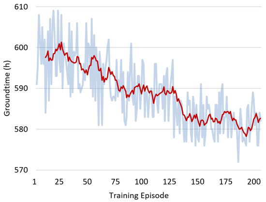 The time horizon considered was 4 weeks and the number of training episodes was 200. At the end of each episode, a new solution is obtained and evaluated according to the predefined KPIs. Figure 8 and Figure 9 show the evolution of the ground time and time slack KPIs, respectively, throughout training. We can see that both are being minimised, meaning the quality of the updated maintenance plan is improving. These results indicate that the agent is able to improve its decision-making capabilities over time and learn to produce better maintenance plans from past experiences. Furthermore, RL is able to produce a feasible maintenance plan that complies with all the problem constraints.