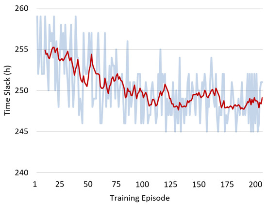 Evolution of the time slack KPI during training (in blue) with a moving average trend line (in red).
