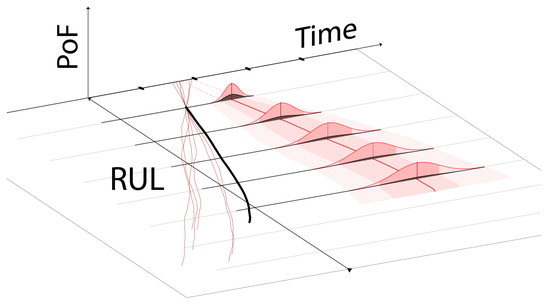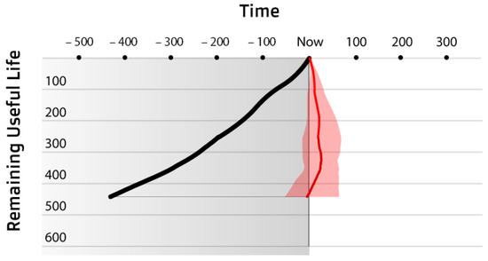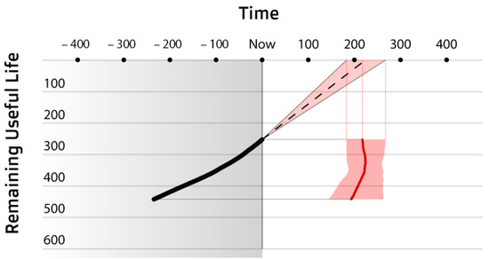 RUL visualisation: RUL trajectory as a black thick line; the current prognostic is shown by the red triangle and the dashed line starting at the end of the black trajectory. The dashed line can show RUL in single value or the mean of a PDF. The width of the triangle marks one standard deviation away from the mean or a minimum and maximum RUL; the red area in the lower right zone represents the Expected End of Life (EEoL) according to each RUL prognostic.
