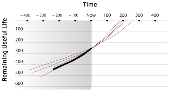 RUL trajectory comparison showing some past trajectories aligned with a current trajectory. The current trajectory is represented with the black line and the past trajectories are represented with the thin red lines.The past trajectories are aligned by the time they had a prognostic similar to the last prognostic of the current trajectory. With this representation we can see how the other trajectories behaved after this point. When there is a new prognostic, the trajectories are re-aligned using the new prognostic value.