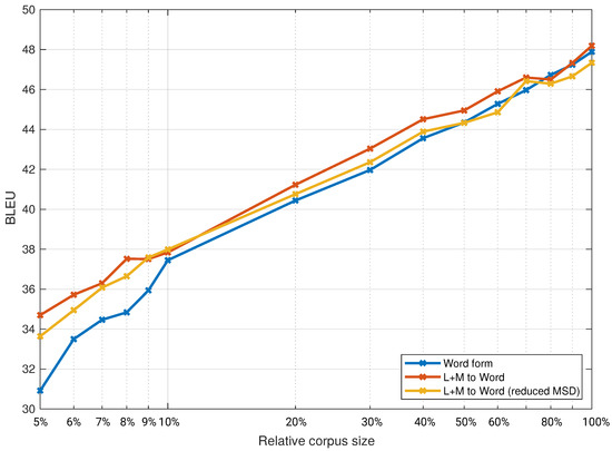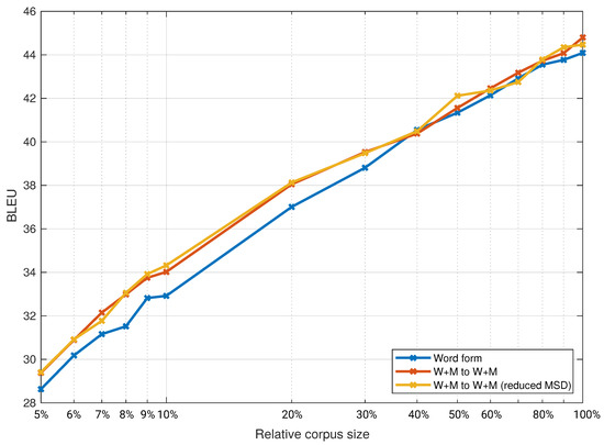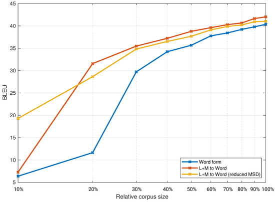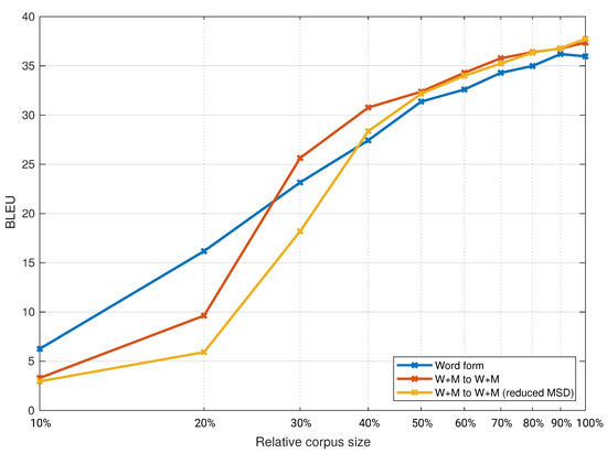 At first, machine translation was guided by rules. Corpus-based approaches followed. They were notably better and easier to use than the preceding rule-based technologies. Statistical machine translation (SMT) [1] is a corpus-based approach, where translations are generated on the basis of statistical models whose parameters are derived from the analysis of bilingual and monolingual text corpora. For a long time, SMT was the dominant approach with the best results. Migration from SMT to neural machine translation (NMT) started in 2013. In [2], a first attempt was made, where a class of probabilistic continuous translation models was defined that was purely based on continuous representations for words, phrases, and sentences and did not rely on alignments or phrasal translation units like in SMT. Their models obtain a perplexity with respect to gold translations that was more than 43% lower than that of the state-of-the-art SMT models. Using NMT was, in general, a significant step forward in machine translation quality. NMT is an approach to machine translation that uses an artificial neural network. Unlike SMT systems, which have separate knowledge models (i.e., language model, translation model, and reordering model), all parts of the NMT model are trained jointly in a large neural model. Since 2015, NMT systems have been shown to perform better than SMT systems for many language pairs [3,4]. For example, NMT generates outputs that lower the overall post-edit effort with respect to the best PBMT system by 26% for the German–English language pair [5]. NMT outperformed SMT in terms of automatic scores and human evaluation for German, Greek, and Russian [6]. In recent years NMT has also been applied to inflectional languages such as Slovene, Serbian, and Croatian. Experiments in [7] showed that on a reduced training dataset with around two million sentences, SMT outperformed the NMT neural models for those languages. In [8], NMT regularly outperformed SMT for the Slovene–English language pair. In the present paper, we will more systematically analyze NMT performance using training corpora of different sizes.