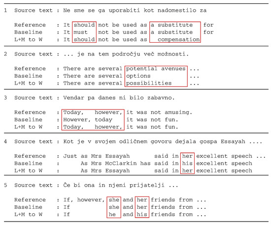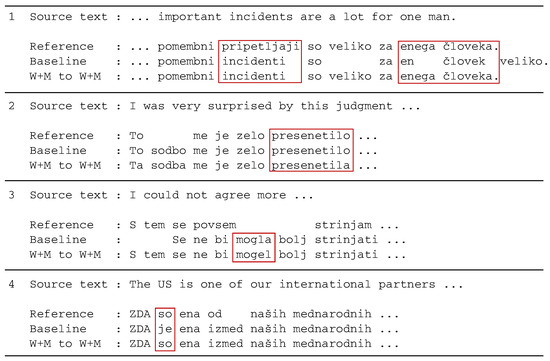 A comparison between the baseline translations and the translations from the improved systems can give us more insight into the different performances of the two systems. Examples from the translation from Slovene to English can be seen in Figure 5.