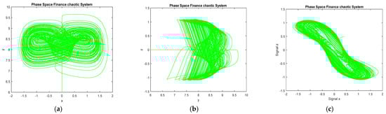 Output MATLAB simulation of the financial chaotic system (1) with Y (0) = (0.4, 0.2, 0.5) and (a, b, c) = (7.6, 0.1, 0.2): (a) x-y plane, (b) y-z plane, and (c) x-z plane.