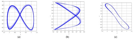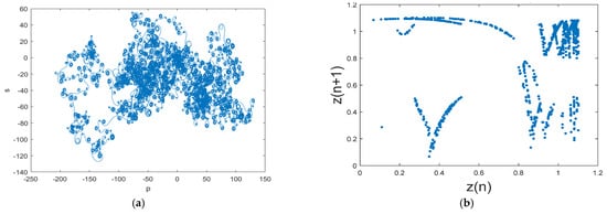 The Poincaré map is used to analyzed the motion characteristics of the multivariable autonomous system [45]. The phase diagram of the Poincaré map well characterizes the reciprocating non-periodic characteristics of chaos. If the Poincaré map is neither a finite set nor a closed curve, then the corresponding system’s motion is in a chaotic motion state. More specifically, if the system does not experience external noise disturbance and there is certain damping, then the Poincaré map will be a point set with a detailed structure. Moreover, if the Poincaré map is a finite set of a point, then the corresponding system motion is periodic. The Poincaré map of system (1) in Figure 2b likewise exhibits chaotic characteristics.
