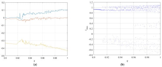 In this work, the special-order q of the fractional financial chaotic system (12) has been used as a parameter to control the bifurcations and develop additional sophisticated dynamics. In this study, the Lyapunov exponent analysis was validated using the Wolf algorithm [46]. We set , with x (0) = 0.4, y (0) = 0.2, and z (0) = 0.5. It is obvious from Figure 5 that the Lyapunov exponent spectrum coincides with the bifurcation diagram. Obviously, the fractional financial system (12) is able to display periodical and chaotic states.