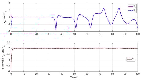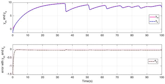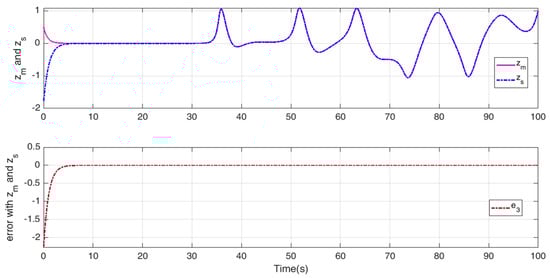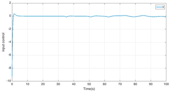 Under the new controller (26), the complete synchronization and error synchronization of the nonlinear master–slave systems (13) are as presented in Figure 6, Figure 7 and Figure 8. The controller input is shown in Figure 9.