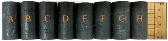The raw coal, from the Pingdingshan Coal Mine in Henan Province, China, is between 1006 m and 1137 m deep. By official standards, the raw coal was processed into 8 cylindrical coal samples with a diameter of 25 mm and a length of 50 mm, as shown in Figure 3. According to the composition analysis of the X-ray fluorescence spectrum, the coal samples do not contain substances that affect the NMR results.
