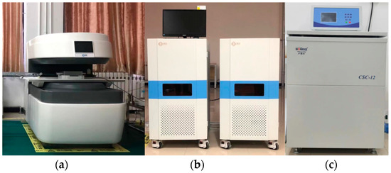 Figure 4. Experimental facilities: (a) magnet cabinet; (b) NMR device; (c) high-speed centrifuge. - (4)