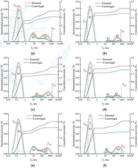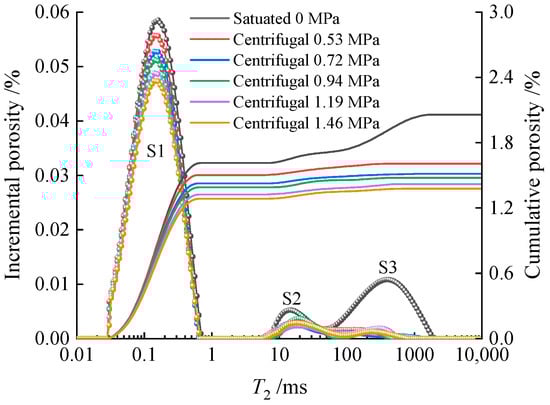 The purpose of the centrifugation experiment is to obtain the centrifugal force suitable for coal samples. The optimal centrifugal force can achieve accurate calibration of the T2 cutoff value of NMR. The accurate selection of centrifugal force is very important. If the centrifugal force is small, the T2 cutoff value will be larger, the bound water saturation will be larger, and the seepage capacity of coal will also be underestimated. To obtain the best centrifugal force of deep coal, centrifugal tests were carried out on the selected sample F under the centrifugal force of 0.53 MPa, 0.72 MPa, 0.94 MPa, 1.19 MPa, and 1.46 MPa. NMR was used to measure the coal sample after each centrifugation.