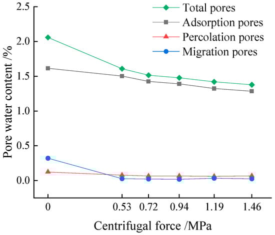 Figure 5 shows the NMR T2 spectra of sample F with the characteristics of three peaks. With the increase in centrifugal forces, the cumulative porosity of sample F decreases gradually. According to the pore classification method [34,35,36,37], the peak S1 (T2 < 2.5 ms) of the T2 spectrum was defined as adsorption pores. The peak S2 (2.5~100 ms) was defined as the percolation pores. The peak S3 (T2 > 100 ms) was defined as migration pores. In Figure 6, with the increase in centrifugal force, the water content of each pore decreases gradually. The water content of adsorption pores and total pores has the same trend and similar value. It is higher than percolation pores and migration pores.