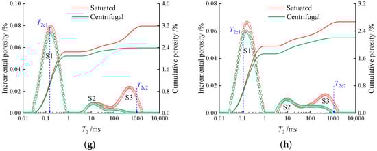 After centrifugation, the water content of the adsorption pores of the samples did not change obviously. Yao [38] gave the T2 boundary between capillary water and film water, T2 = 0.25 ms. This indicates that the film water mainly exists in the adsorption pores. The dual T2 cutoff values method was applied to remove the effect of water film thickness on pore size. In Figure 7, the adsorption pores are divided into two parts by the first cutoff value T2c1. The water in the adsorption pores between 0 ms and T2c1 is called immovable film water, and the water between T2c1 and 0.25 ms is called partially movable film water. Adsorption pores filled with immovable film water are not considered to be involved in water seepage [38,39]. Therefore, we removed this part of adsorption pores to minimize the influence of water film thickness on pore diameter.