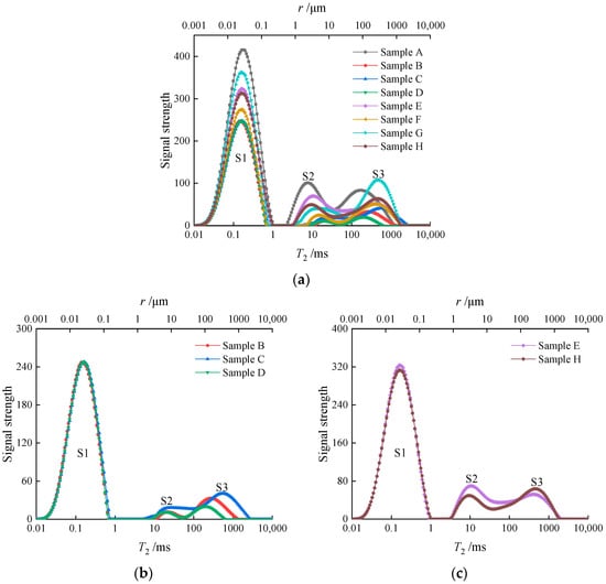 In Figure 8a, there are three peaks (S1, S2, S3) in the T2 spectra of coal samples. The S1 peak distribution of coal samples is similar, and the peak value is around 0.1 ms. However, the peak intensity is slightly different, and the distribution of S2 and S3 peaks is significantly different. In Figure 8b, the S1 peaks of samples B, C, and D almost coincide, indicating that their adsorption pore structures are similar. We find that the porosity, T2g, and T2c1 of the samples are indeed similar in Table 1. The difference between the samples is mainly reflected in the S2 peak and S3 peak, which represent the percolation pores and migration pores. The pore structures of samples E and H in Figure 8c also have similar characteristics.