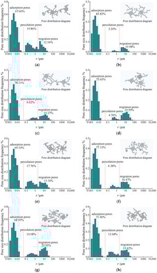 Pore size distribution of coal samples: (a) sample A; (b) sample B; (c) sample C; (d) sample D; (e) sample E; (f) sample F; (g) sample G; (h) sample H.