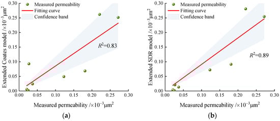 Table 3 shows the parameters needed to calculate the SDR model and Coates model. The permeability calculation results of the three models are shown by comparing them with the measured permeability in Figure 11a–c. The results show that the correlation coefficients with measured permeability are 0.61, 0.83, and 0.89, respectively. Liu’s model has the lowest prediction accuracy, its confidence interval is larger, and the number of samples in the confidence interval is the least.