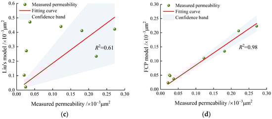 The calculation effect of the FCP model is shown in Figure 11d, and its correlation coefficient reaches 0.98. The correlation coefficient between measured permeability and predicted permeability of the FCP model is the highest, which indicates that the prediction accuracy of the FCP model is better than that of other models. The confidence interval of the FCP model is the narrowest, and the number of samples in the confidence interval is also the largest. The results show that the stability and reliability of the FCP model are higher than those of the three models. The accuracy and validity of the FCP model for deep coal permeability prediction are verified on this basis.