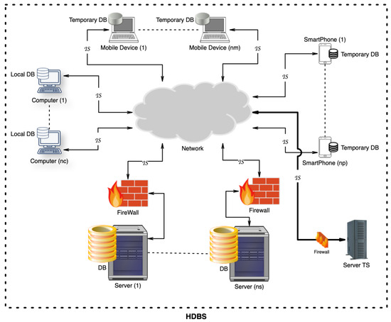 The aforementioned devices contain databases, with temporary databases stored in and , which means that the data will occasionally be transferred to specialized servers. The credentials required for the authentication and secure communications assurance systems are managed by a specialized device, called a trusted server (). The presented system is described in Figure 1.