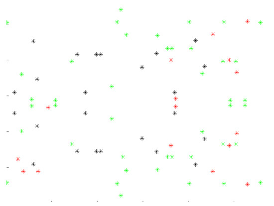 In Figure 3, three types of points are presented: green, representing those that passed the ESG algorithm test, from step 4, and that have cryptographic properties; gray, those that passed the test at the returned step according to the minimum standard value imposed by the security policies; and red, those that did not pass the test at step 5. They represent a limited number from possible sets and are computed for an interval within the subspaces within ; defines their credentials within the algorithm.