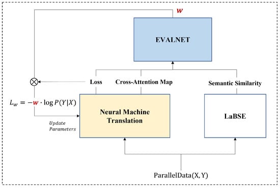 At 20% of the entire training epochs, EvalNet was first trained using the features extracted from the NMT system and LaSBE. Since then, EvalNet was applied for training of the NMT system. At 75%, EvalNet was newly trained again and applied for the training of the NMT system for the rest of the training epochs. This training procedure is the same as that in MentorNet. The NMT systems were evaluated as the BLEU score using sacrebleu (https://github.com/mjpost/sacreBLEU (accessed on 26 October 2022)) library.