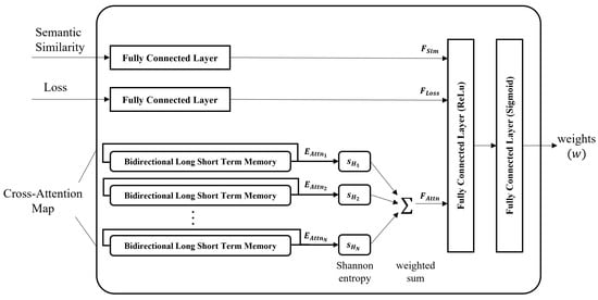 The semantic similarity and the loss value are converted to feature vectors and through fully connected layers, respectively. Cross-attention maps are converted to a feature vector through LSTM layers. The three feature vectors , , and are concatenated and fed into the following two fully connected layers. Because the activation function of the second layer is a sigmoid function, the output weight w of EvalNet ranges from 0 to 1, where