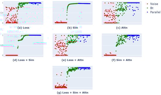 The graphs from Figure 5d–g are the results of combining the features of EvalNet. Among them, Figure 5d displaying EvalNet using the loss and similarity, and Figure 5f, displaying EvalNet using the similarity and cross-attention maps, seemed to have the most desirable weight distributions. In Figure 5d,f, most noisy data have weights of zero and most parallel data have weights of one, while most augmented data have weights of 0.5 or greater depending on their qualities. However, comparing Figure 5d,f, we realized that the combination of Loss + Sim is slightly less capable of discriminating the quality of the augmented data than the combination of Sim + Attn. These figures can also explain why the combination of the cross-attention maps and the semantic similarity has worked best in the results of Table 4.