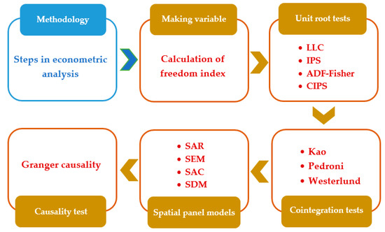 The main purpose of this study was to assess the impact of freedom on economic growth in European countries using spatial panel data models. The estimation procedures used in the study are depicted in Figure 1. At each stage of the estimation process, the activities were carried out in chronological order. According to the literature review and research objectives, the following hypotheses were proposed for this study.