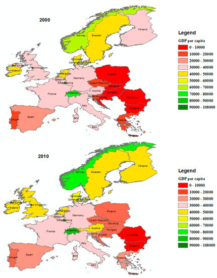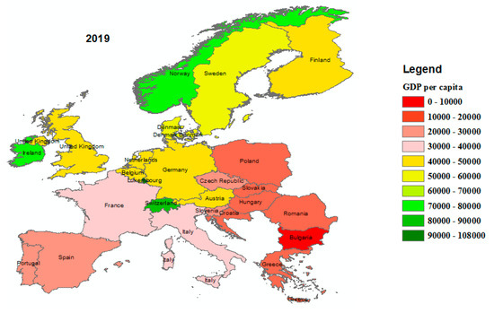Figure 2 depicts the GDP per capita in the European countries for the years 2000, 2010, and 2019. It shows how GDP per capita is unevenly distributed across European countries over time and space. Regionally, Northern Europe has comparatively larger GDP per capita. This consists of countries like Norway, Sweden, Denmark, Ireland, Finland, and the United Kingdom. In addition, we discovered that GDP per capita had significantly increased over the research period in most countries.