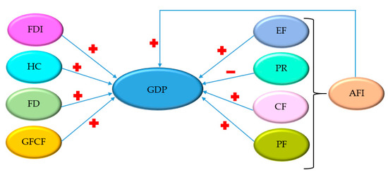 Relationship between the variables analyzed and economic growth in European countries. Note: GDP, FDI, HC, FD, GFCF, EF, PR, CF, PF, and AFI denote economic growth, foreign direct investment, human capital, financial development, capital stock, economic freedom, political rights, civil liberties, press freedom, and aggregated freedom, respectively.