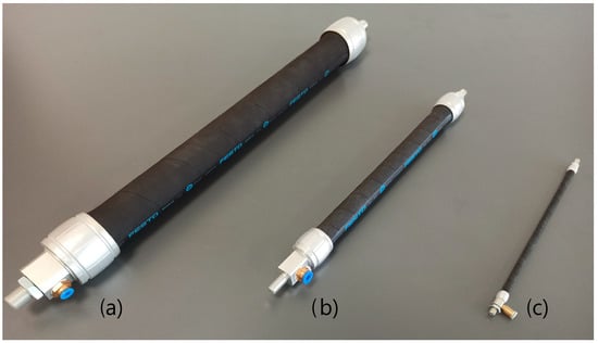 Fluidic muscles with press-fitted connections: (a) DMSP-40, (b) DMSP-20, and (c) DMSP-5 [].
