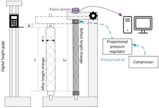 A schematic diagram of the test stand that was used for measuring the characteristics of the DMSP-5 muscle is shown in Figure 3. The test stand was designed to measure the muscle’s static characteristics under isobaric conditions (i.e., with constant pressure). The stand consisted of a structure on which the DMSP-5 muscle was attached (both ends of the muscle were firmly attached to the frame of the structure). Compressed air was let into the muscle by the compressor, which was regulated as needed (1–6 bar, with a step of 0.5 bar) using a proportional pressure regulator. With the help of a sliding mechanism, the required contraction of the muscle was ensured, which was measured using a digital height gauge. Therefore, the input value for the measurement was the required muscle contraction (calculated to the length of the muscle) under constant pressure in the muscle. The output monitored variable was the tensile force of the muscle recorded using the force sensor at a given pressure constant.
