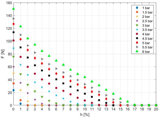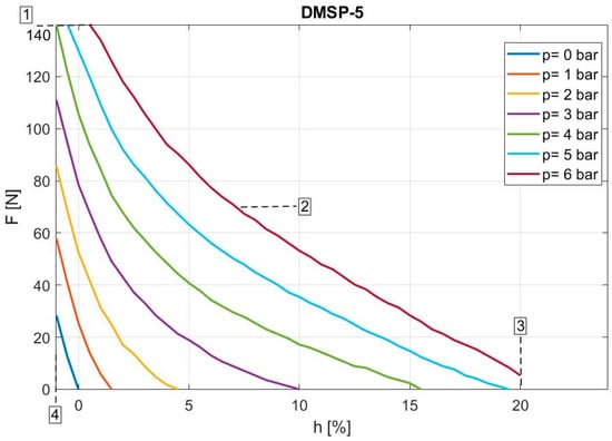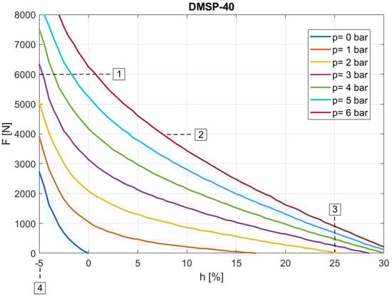 Figure 4 shows the dependences of tensile force F (N) on contraction h (%) from the nominal muscle length for the DMSP-40 muscle type at constant pressures in the range from 0 to 6 bar, as measured and interpreted by the manufacturer. In the picture, four boundary curves can be seen, where boundary 1 expresses the minimum theoretical force at the maximum operating pressure (6000 N). Boundary 2 represents the maximum operating pressure, which is a value of 6 bar. Boundary 3 expresses the maximum deformation; for the DMSP-40 muscle, this is 25% of the nominal muscle length. Finally, boundary 4 is the maximum pretensioning, which for the DMSP-40 muscle is −5% of the nominal muscle length. The grey area in the graph expresses the permissible operating range for the given muscle.