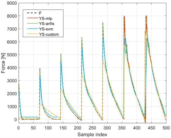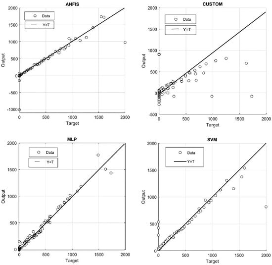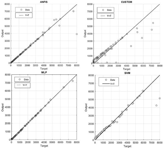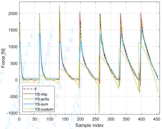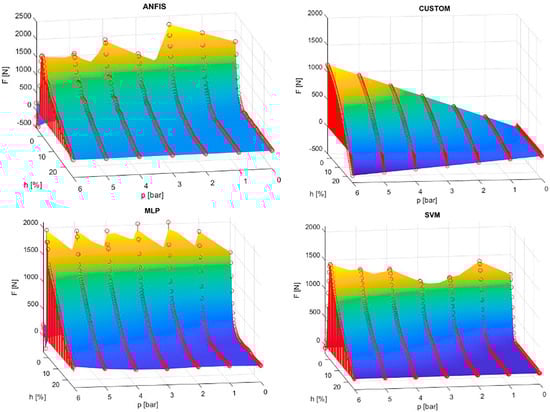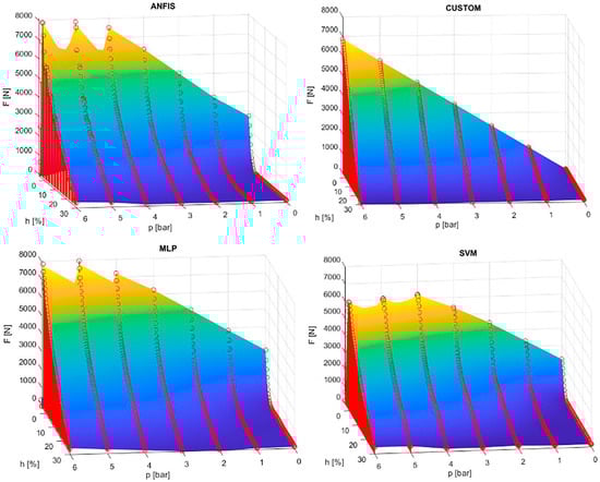 To compare the results of the MLP, SVM, and ANFIS models, a simple four-parameter model for the force function of the fluidic muscles was used. The model included the multiplication of two terms: one with the first independent variable (i.e., pressure), and the second with the second-degree polynomial function of the second independent variable (i.e., contraction). The model was named a custom model, taken for purposes of comparison from []. The name custom model is related to the Curve Fitting Toolbox used, where the custom equation option was selected in the toolbox when entering the adopted model. This model, commonly applied in the model-based control design of FM-actuated mechanisms mentioned in [], has the form of Equation (18):