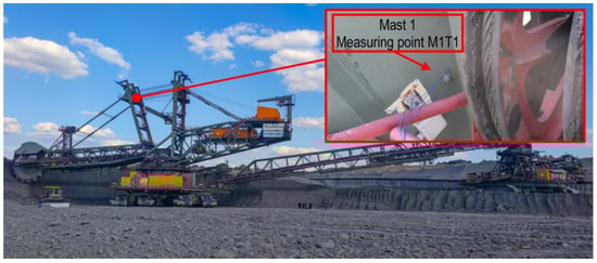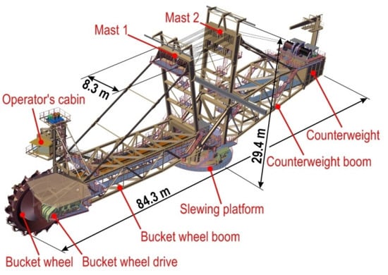 Continuous earthmoving machines, such as bucket-wheel excavators (BWEs), are the largest mobile terrestrial machinery [1] and the backbone of the surface mining systems, one of the most significant achievements in the field of mining in the 20th century [2]. Currently, there is a strong trend towards their revitalization and modernization [3], alongside increasing the degree of reliability [4] and safety [5,6], reducing the financial losses caused by downtimes [7] and increasing their operational life. As a rule, said procedures include mechanical equipment (the bucket-wheel drive [8], the bucket wheel [9], the buckets [10], etc.) and electrical equipment (frequency-controlled drivetrains, control and safety/protective systems [11,12], condition monitoring systems [13], etc.), while preserving the existing load-carrying structure [14]. For this reason, revitalizations of BWEs are accompanied by extensive numerical–experimental studies aimed at ensuring their almost infinite durability [3].