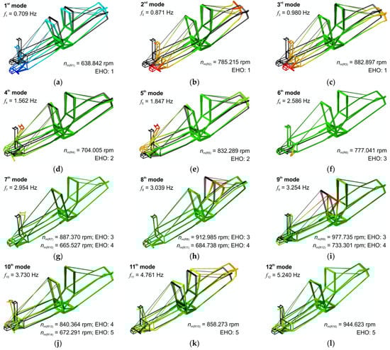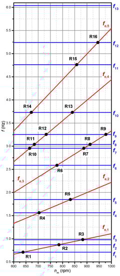 The nominal FREM at the analyzed BWE is nm,nom = 1000 rpm. In continuation of the research, the FREM was varied over a continuous domain with the range between 600 rpm and 1000 rpm, in accordance with the parameters of the bucket-wheel drive gearbox. The frequencies of the first five excitation harmonics correspond to the outlined FREM boundaries (Table 1) and were determined with Equation (1). The highest frequency of the fifth harmonic of excitation (fe,5,max = 5.548 Hz) is lower than the thirteenth natural frequency of the model (f13 = 6.041 Hz, Table 2). In the considered case, the intersection of the infinite set of the first five harmonics of excitation and the finite set of the first twelve natural frequencies of the model contain a total of sixteen elements (Figure 3), which means that sixteen resonant states might occur in the low frequency area (up to 5.5 Hz). The resonant FREMs (nm(Rj) j = 1, 2, …, 16, Table 3) are determined by equaling the frequency of the k(j)-th harmonic of excitation (fe,k(j), Equation (1)), which causes the j-th resonant state (Figure 3) and the frequency of the i(j)-th mode of the dynamic model (fi(j)), excited in the j-th resonant state, (Table 2, Figure 3).