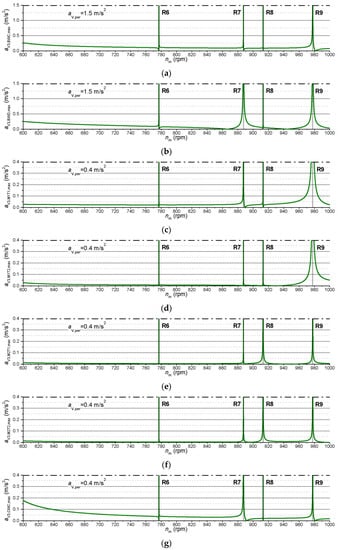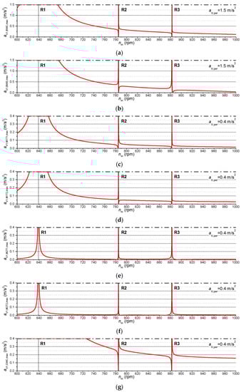 Response to the third harmonic of excitation—maximal vertical accelerations of the referent points of the slewing superstructure: (a) BWC; (b) BWD; (c) M1T1; (d) M1T2; (e) M2T1; (f) M2T2; (g) CWC.