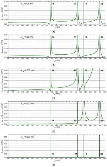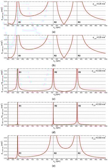 Response to the third harmonic of excitation—maximal lateral accelerations of the referent points of the slewing superstructure: (a) BWC; (b) BWD; (c) M1T1 and M1T2; (d) M2T1 and M2T2; (e) CWC.