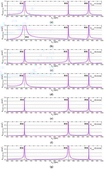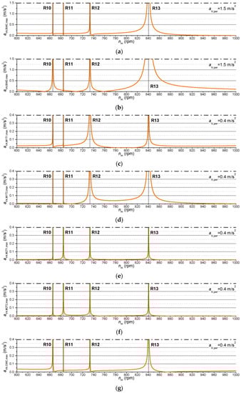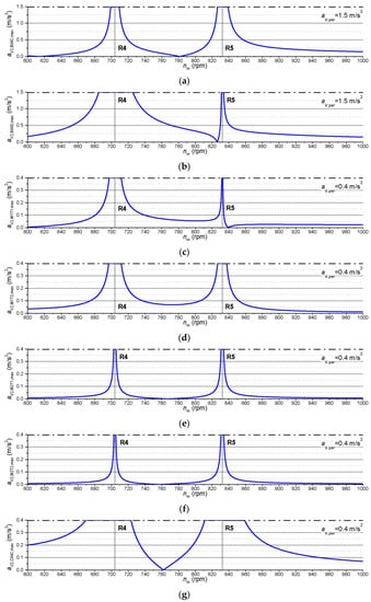 Response to the fourth harmonic of excitation—maximal vertical accelerations of the referent points of the slewing superstructure: (a) BWC; (b) BWD; (c) M1T1; (d) M1T2; (e) M2T1; (f) M2T2; (g) CWC.
