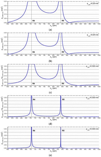 Response to the fourth harmonic of excitation—maximal lateral accelerations of the referent points of the slewing superstructure: (a) BWC; (b) BWD; (c) M1T1 and M1T2; (d) M2T1 and M2T2; (e) CWC.