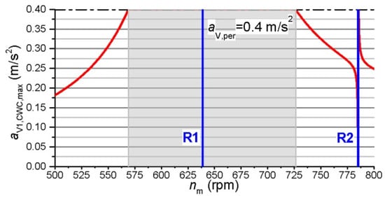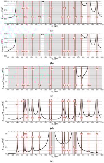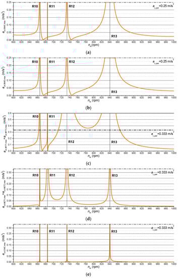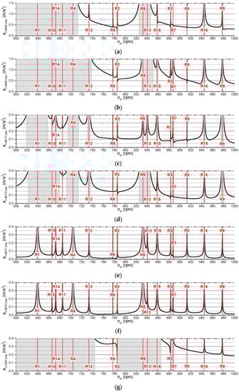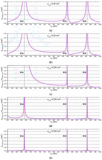 Based on the cut-off scanning of the responses (maximal intensities of accelerations) of the referent points of the slewing superstructure to the first five harmonics of excitation (Figure 4, Figure 5, Figure 6, Figure 7, Figure 8, Figure 9, Figure 10, Figure 11, Figure 12 and Figure 13), the boundaries of the FREM resonant domains were determined: the lower limit is nm,Rj,LL and the upper limit is nm,Rj,UL, j = 1, 2, …, 16 (Table 5, Table 6, Table 7, Table 8, Table 9, Table 10, Table 11, Table 12, Table 13 and Table 14).