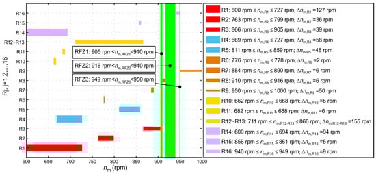 The FREM resonant domains for the span of 600 rpm ≤ nm ≤ 1000 rpm (∆nm,R12-R13 = nm,R13,UL–nm,R12,LL).