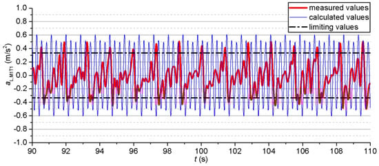 Starting from the fact that, by definition (Equation (1)), frequencies of higher harmonics of excitation are commensurable with the frequency of its fundamental harmonic, the maximal intensities of accelerations of the referent points of the dynamic model of the slewing superstructure (Figure 15 and Figure 16) were determined by superposing the responses (the intensities of the corresponding accelerations) caused by the individual action of the first five harmonics of excitation.
