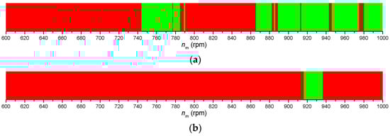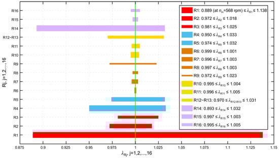 Naturally, for the considered referent points of the dynamic model, the j-th (j = 1, 2, …, 16) FREM resonant domains are mutually different (Table 5, Table 6, Table 7, Table 8, Table 9, Table 10, Table 11, Table 12, Table 13 and Table 14). Additionally, for the same referent point of the model, the j-th FREM resonant domains, determined according to the limiting vertical and lateral accelerations, are not identical. Overlapping the j-th FREM resonant domains, determined according to limiting vertical and lateral accelerations for all referent points of the model, yields the boundaries and widths of all 16 FREM resonant domains for the entire dynamic model of the slewing superstructure (Figure 14), as well as widths of the resonant-free zones (RFZs).