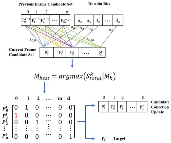 The candidate point in the optimal match that matches the previously detected-target is set as the target of the current frame. Considering that the candidate points detected on the previous and current frame are not necessarily a complete one-to-one match, we add a dustbin bit and set the matching score of all candidate points in to this dustbin bit as a certain threshold , which represents the lowest limit of the match score. If a candidate point matches the dustbin bit in the optimal matching, the candidate point is a newly emerging candidate point and we need to add it to the candidate set. We show the flow of target localization in Figure 4. We store the 0th position in the candidate set as the target position. We use the KM matching algorithm to find the optimal match from to [36].